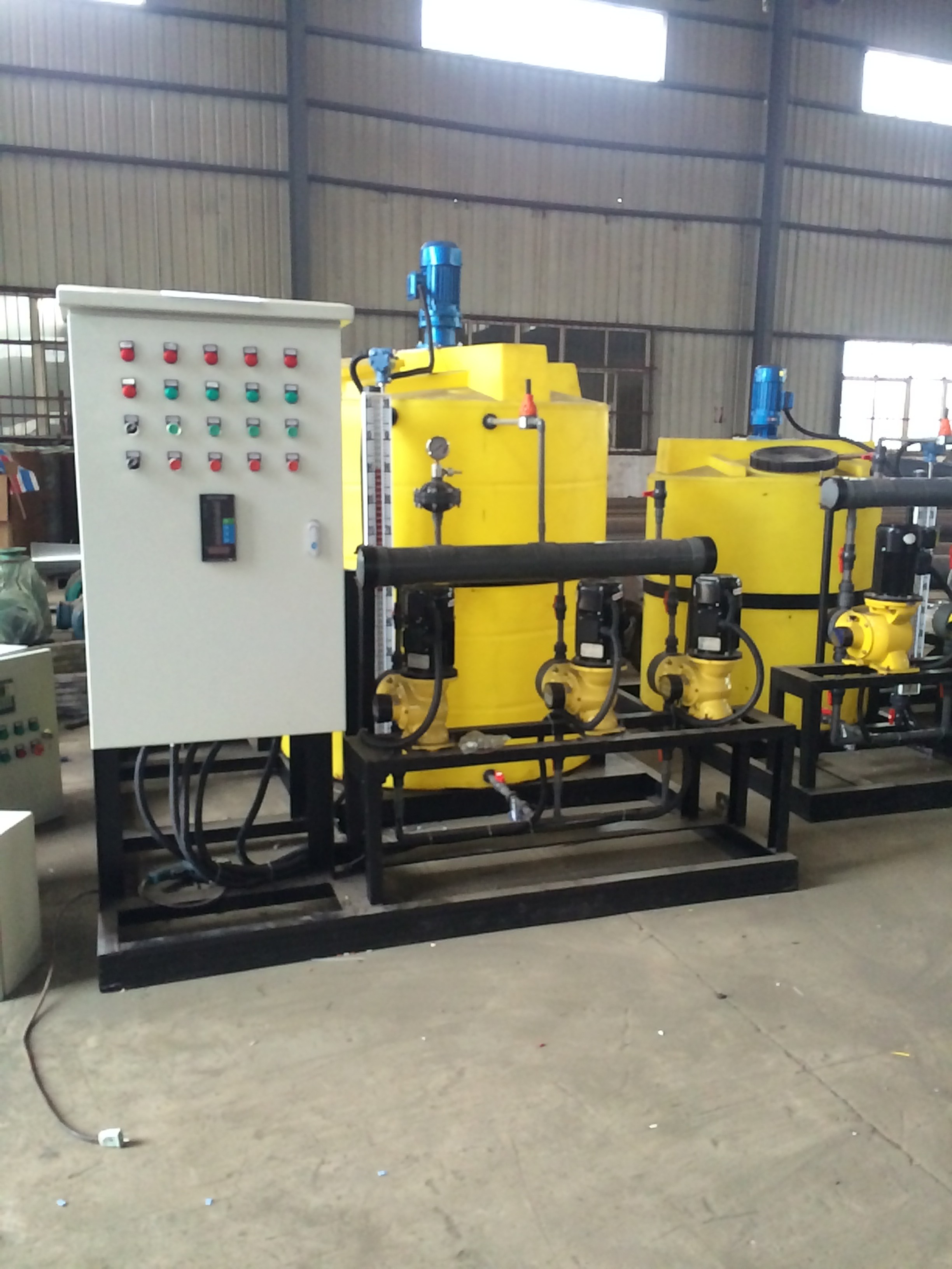 加藥裝置,采用的是機(jī)電一體化結(jié)構(gòu)形式,從安裝上可分為固定式和移動(dòng)式(推車(chē)式),每種形式的加藥裝置均配有攪拌系統(tǒng)、加藥系統(tǒng)和自動(dòng)控制系統(tǒng)。幾個(gè)固定式撬裝可組合成一個(gè)整體,加上變頻控制系統(tǒng),可實(shí)現(xiàn)就地控制、遠(yuǎn)程自動(dòng)控制、手動(dòng)和自動(dòng)相互轉(zhuǎn)換加藥。具有結(jié)構(gòu)緊湊,體積小、噪音低、工作平穩(wěn)、安裝簡(jiǎn)單、操作使用方便等優(yōu)點(diǎn)。